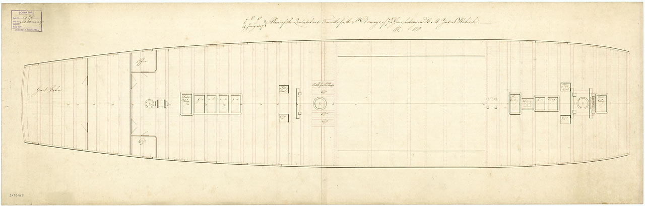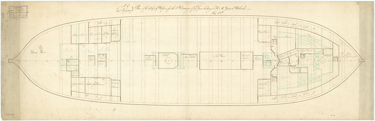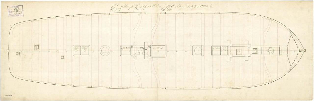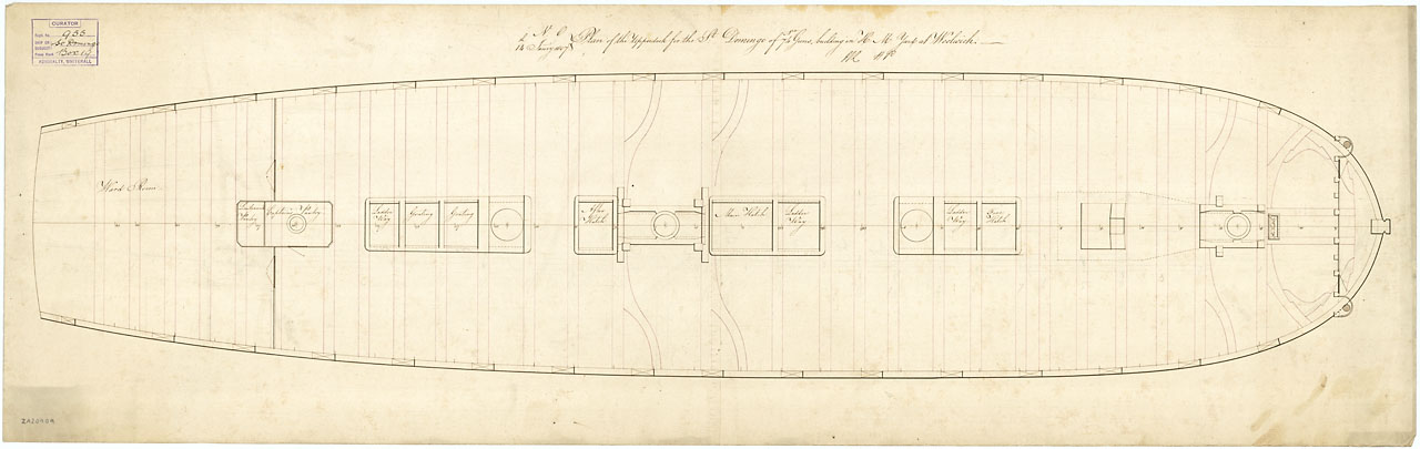 Saint Domingo (1809). Scale: 1:48. Plan showing the lower deck for Saint Domingo (1809), a 74-gun Third Rate, two-decker building at Woolwich Dockyard.