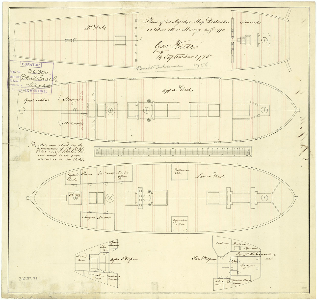Deal Castle (1756). Scale: 1:96.  Plan showing the quarterdeck, forecastle, upper deck, lower deck and fore & aft platforms for Deal Castle (1756), a 20-gun Sixth Rate.  The plan illustrates her as taken off at Sheerness in August 1775 showing the Sta