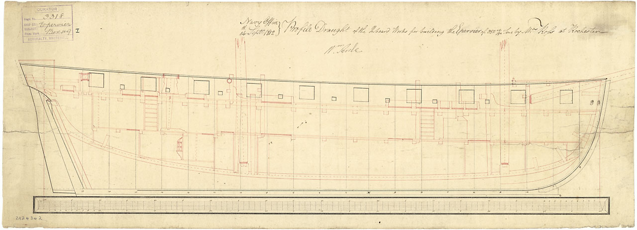 Epervier (1812). Scale: 1:48.  Plan showing the inboard profile for Epervier (1812), an 18 gun Brig Sloop building at Rochester by Mrs Ross.