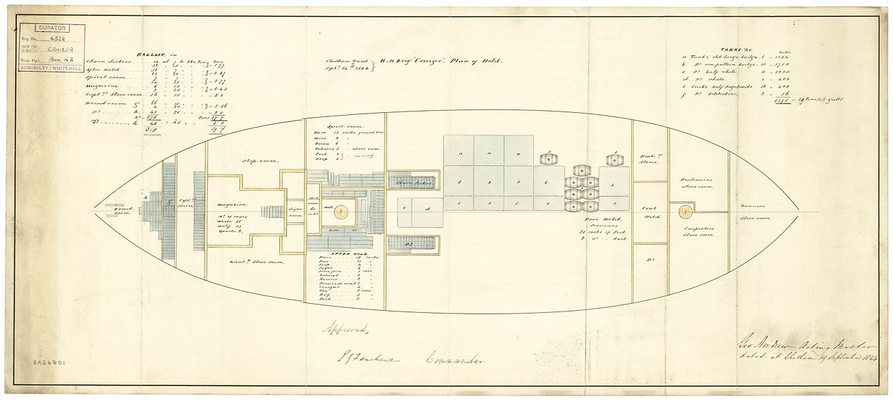 Cruizer (1828) [alternative spelling: Cruiser]. No scale, possibly 1:48.  Plan showing the hold, with the capacities of tanks, ballasts and casks, for the Cruizer (1828) [Cruiser], a flush-deck Ship Sloop when converted to a Brig Sloop.