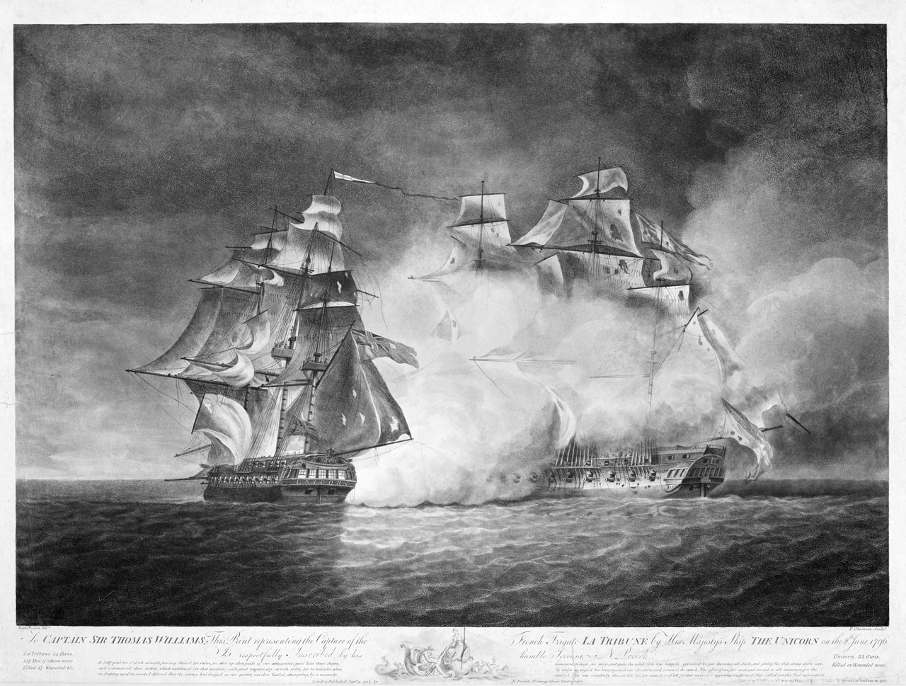 To Captain Sir Thomas Williams, This Print representing the Capture of the French Frigate La Tribune by His Majesty's Ship The Unicorn on the 8th June 1796...Is...inscribed. Hand-coloured.