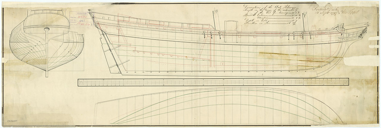 Ant (1797). Scale: 1:48.  Plan showing the body plan with stern board outline, sheer lines with inboard detail and figurehead, and longitudinal half-breadth for Ant (1797), a purchased merchant vessel, as taken off at Portsmouth Dockyard and fitted as a 4