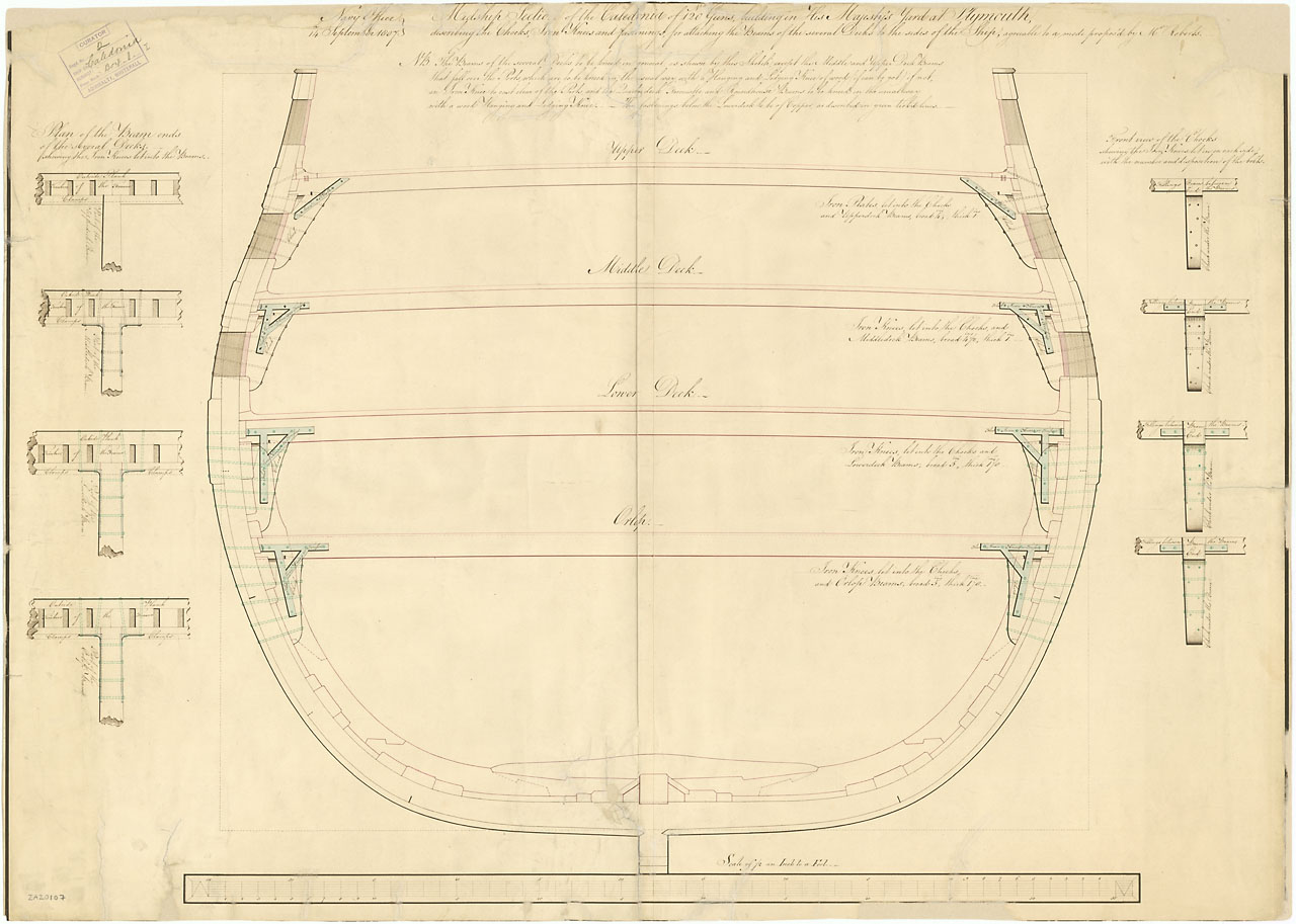 Caledonia (1808). Scale: 1:24.  Plan showing the midship section with details illustrating the method proposed by Mr Roberts of attaching the chocks, iron knees and fastenings for Caledonia (1808), a 120-gun First Rate, three-deck.