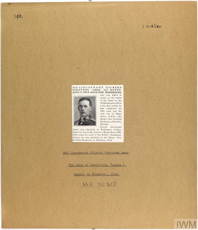 Second Lieutenant Gilbert Stratton Amos. Unit: D Company, 2nd Battalion, King's Own Scottish Borderers. Death: 14 September 1914 Aisne Western Front