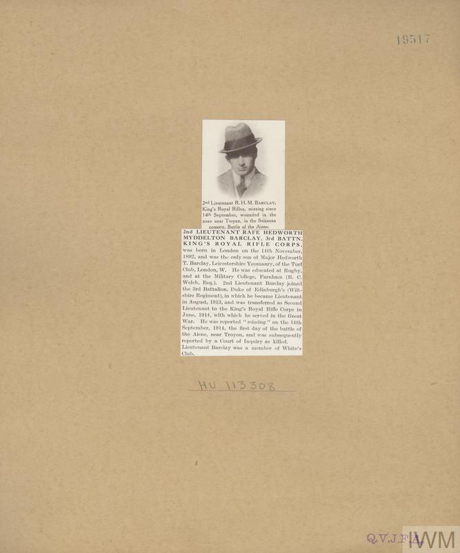 Second Lieutenant Rafe Hedworth Myddelton Barclay. Unit: 2nd Battalion, King's Royal Rifle Corps. Death: 14 September 1914 Aisne Western Front