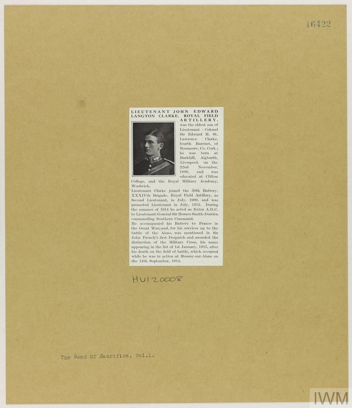 Lieutenant John Edward Langton Clarke MC. Unit: 50th Battery, Royal Field Artillery. Death: 14 September 1914 Killed in action at Moussy-sur-Ainse Western Front