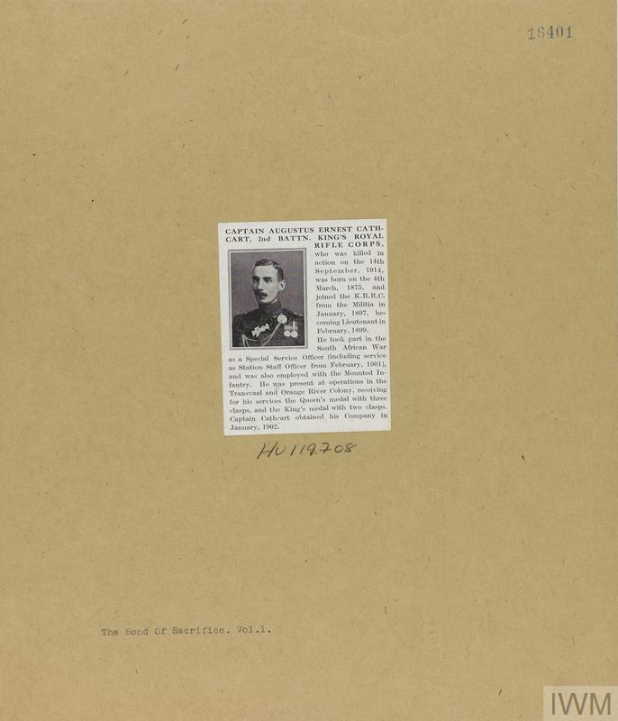 Captain Augustus Ernest Cathcart. Unit: 2nd Battalion, King's Royal Rifle Corps. Death: 14 September 1914 Killed in action Age 39 Western Front