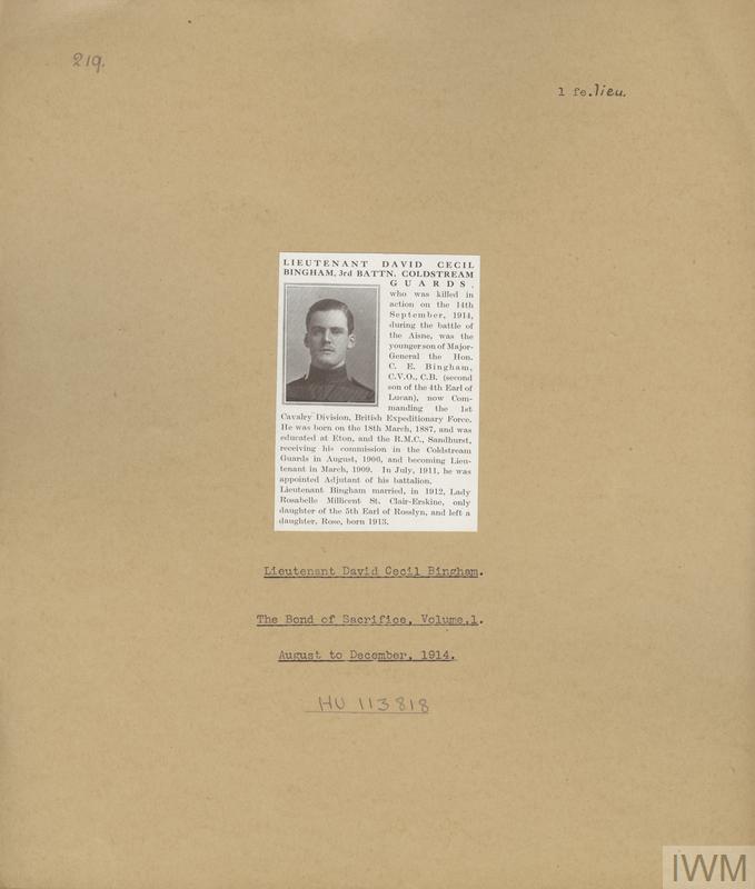 Lieutenant David Cecil Bingham. Unit: 3rd Battalion, Coldstream Guards. Death: 14 September 1914 Aisne Western Front