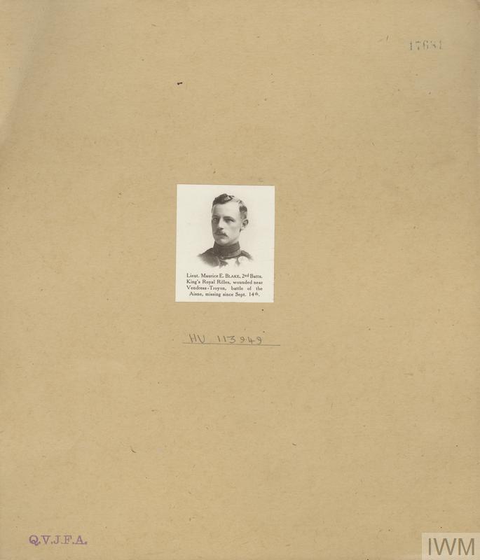 Lieutenant Maurice Frederick Blake. Unit: 2nd Battalion, King's Royal Rifle Corps. Death: 14 September 1914 Aisne Western Front