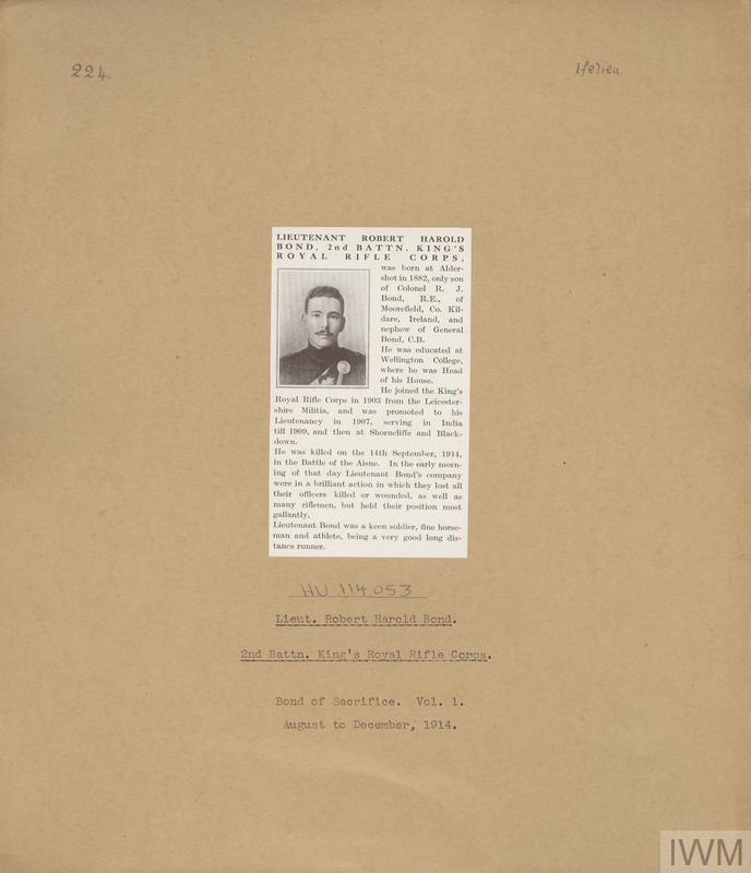 Lieutenant Robert Harold Bond. Unit: 2nd Battalion, King's Royal Rifle Corps. Death: 14 September 1914 Killed in action Western Front