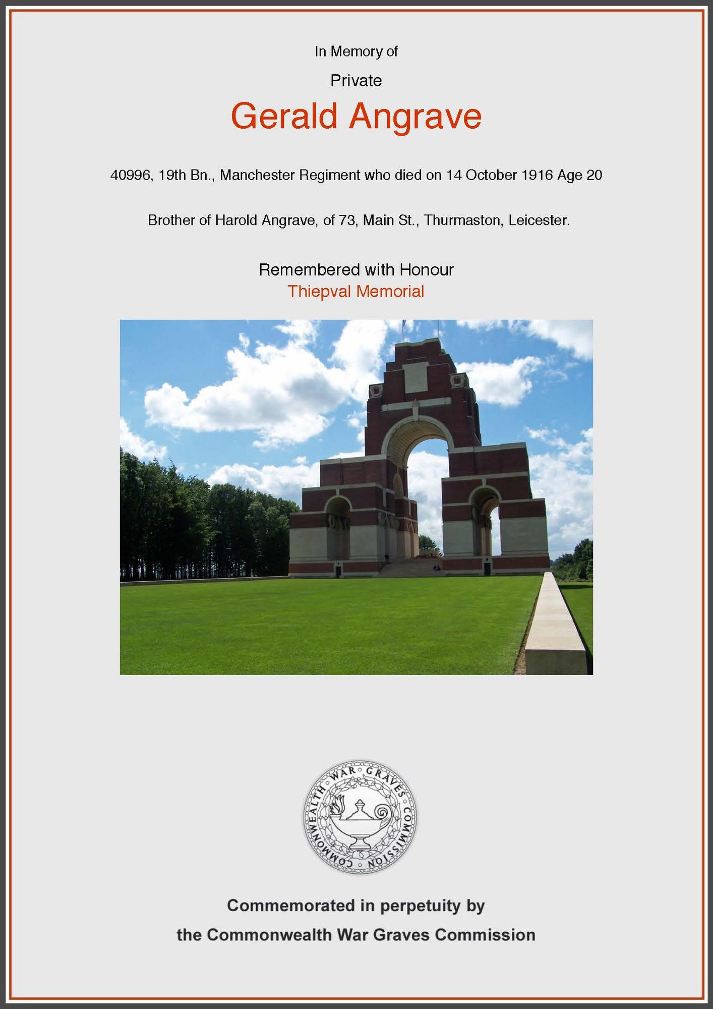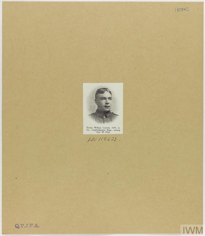 Private William Carter 1691/325311. Unit: "A" Company, 1st Battalion, Cambridgeshire Regiment. Death: 14 October 1916, missing, Somme, Western Front. Commemorated on the Thiepval Memorial.