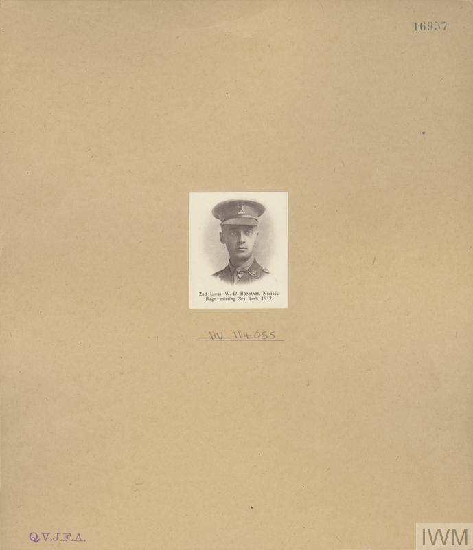 Second Lieutenant William Daniel Bonham. Unit: 7th Battalion, Norfolk Regiment. Death: 14 October 1917. Son of Thomas William and Ann Bonham, of The Chase, King's Lynn, Norfolk.