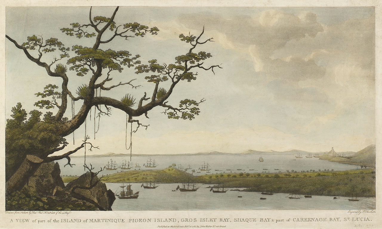 A View of part of the Island of Martinique, Pigeon Island, Gros Islet Bay, Shaque Bay & part of Careenage Bay, St Lucia. Hand-coloured.