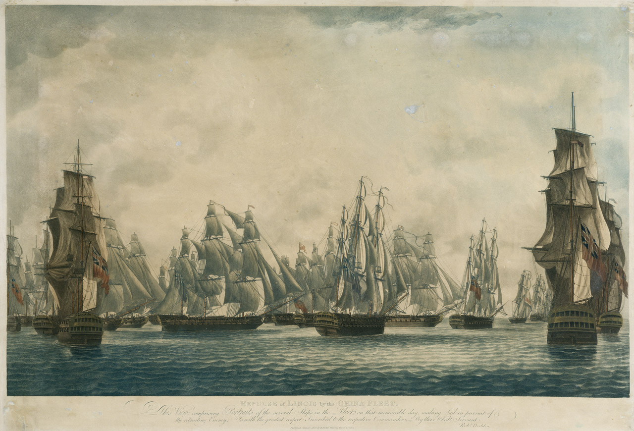 Repulse of Linois by the China Fleet... Ships in the Fleet making Sail in pursuit if the retreating Enemy, 15 Feb 1804. Hand-coloured.