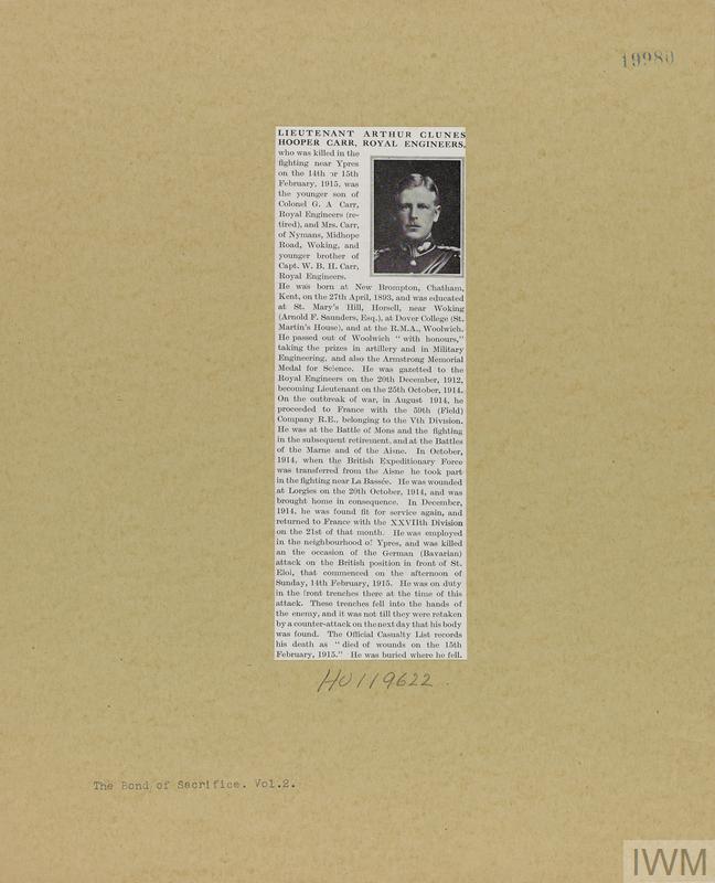 Lieutenant Arthur Clunes Hooper Carr. Unit: Royal Engineers. Death: 15 February 1915 Died of wounds near Ypres Western Front