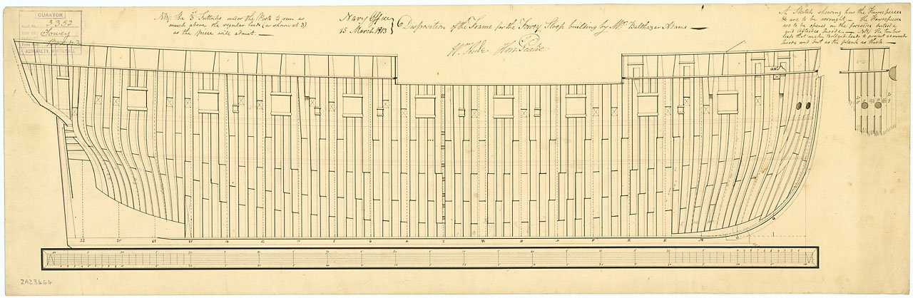 Fowey / Towey (1814). Scale 1:48. Plan showing the framing profile (disposition) for Fowey / Towey (1814), a 26/28-gun Sloop building at Buchlers Hard by Mr Balthazar Adams. Signed William Rule, Henry Peake (Surveyors of the Navy)