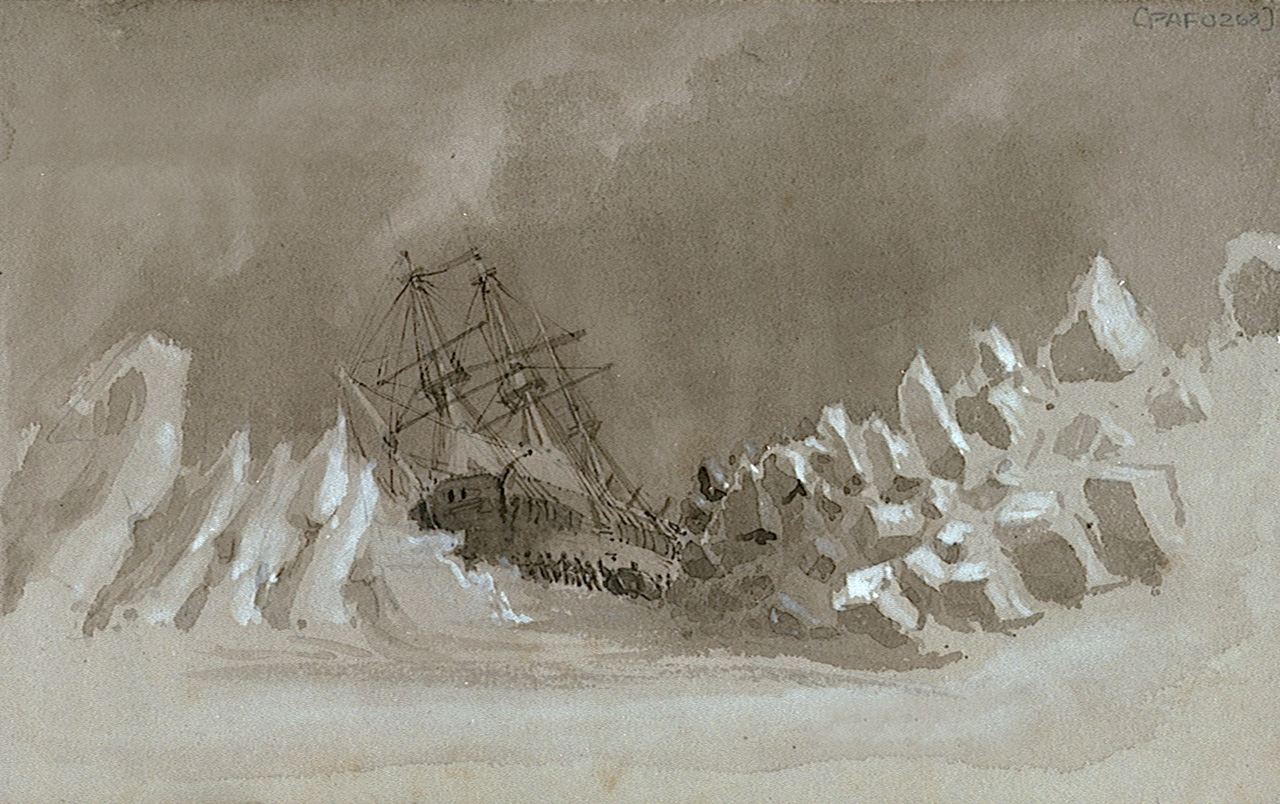 March 15th About 1 PM the ice closed upon the ship... This sketch represents the Terror's situation at 10PM. Bound with PAF0252-PAF0267, PAF0269-PAF0285.; Medium includes graphite.; Heightened with white.