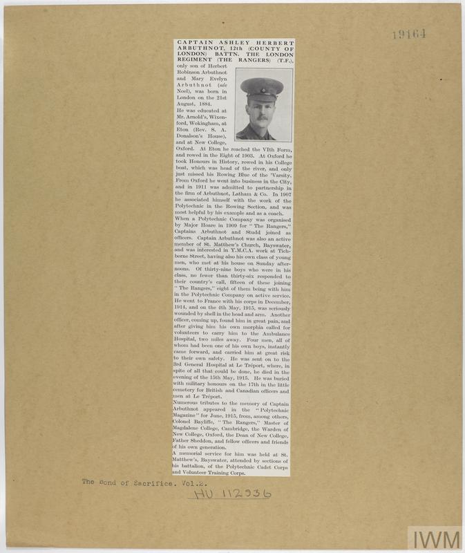 Captain Ashley Herbert Arbuthnot. Unit: A Company, 12th Battalion, London Regiment (The Rangers). Death: 15 May 1915 Western Front