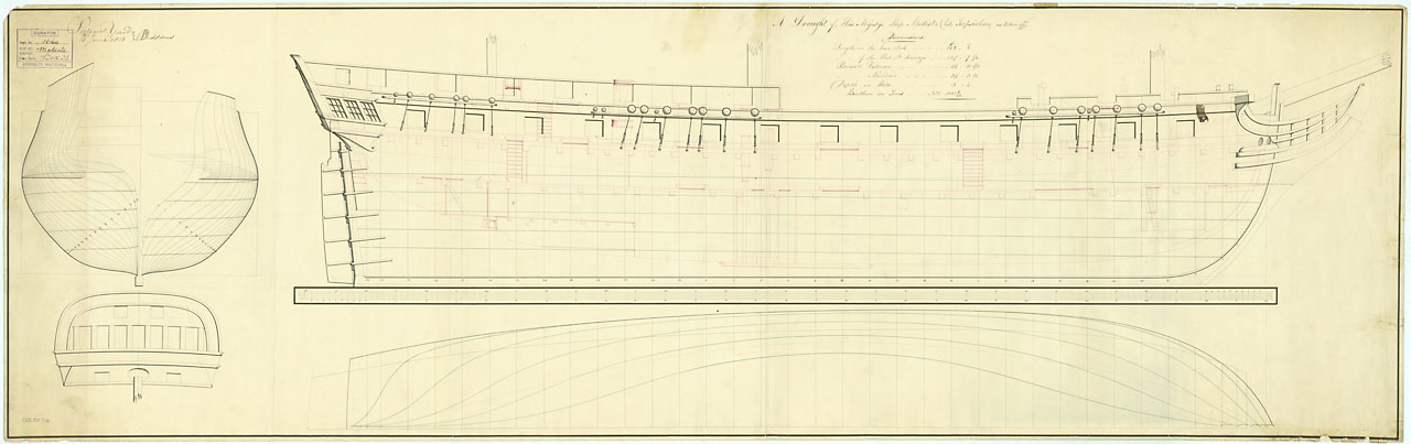 Modeste (captured 1814). Scale: 1:48.  Plan showing the body plans, stern board outline, sheer lines with inboard detail, and longitudinal half-breadth for Modeste (captured 1814), a captured French 40-gun Fifth Rate Frigate, as taken off at Portsmouth Do