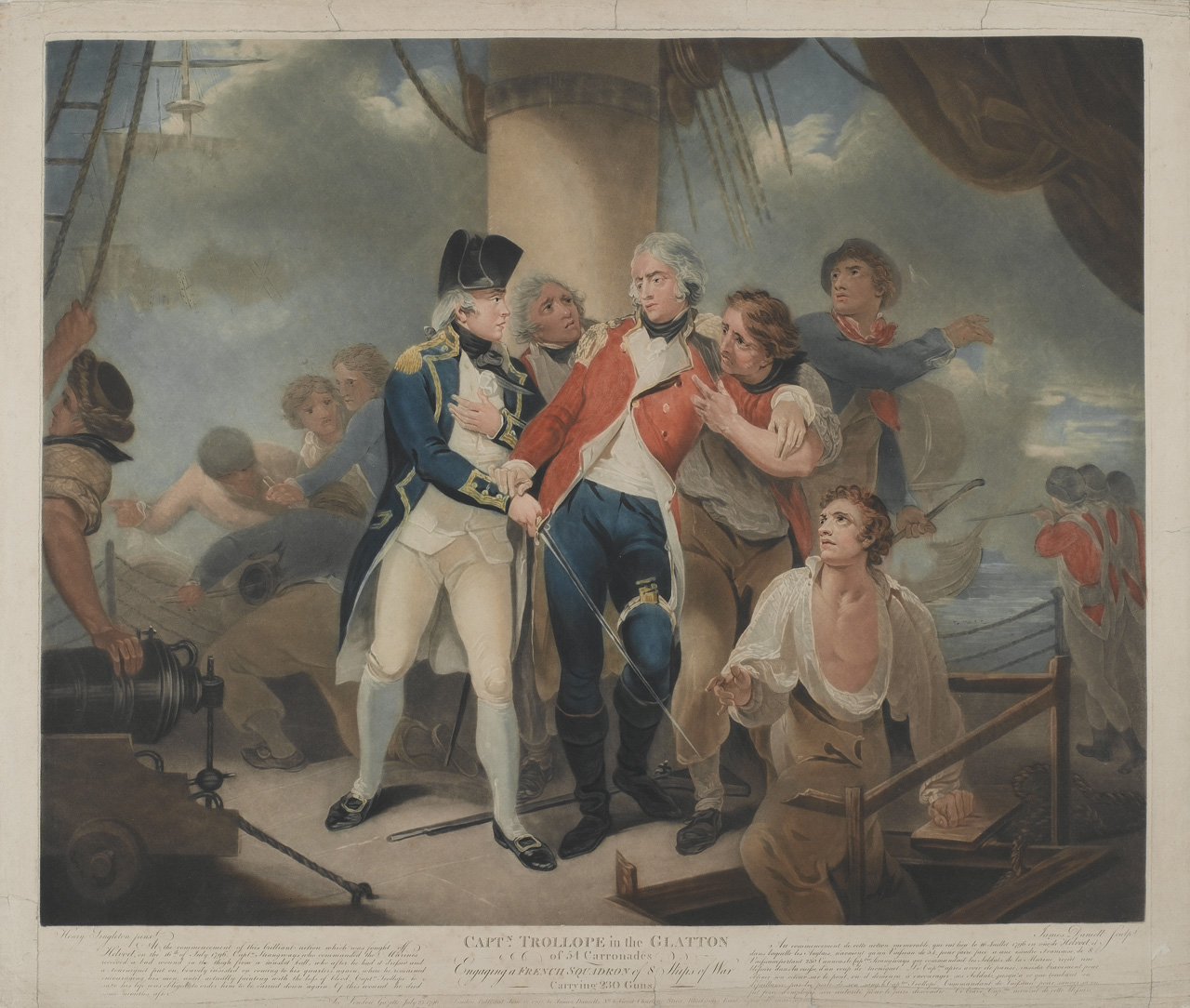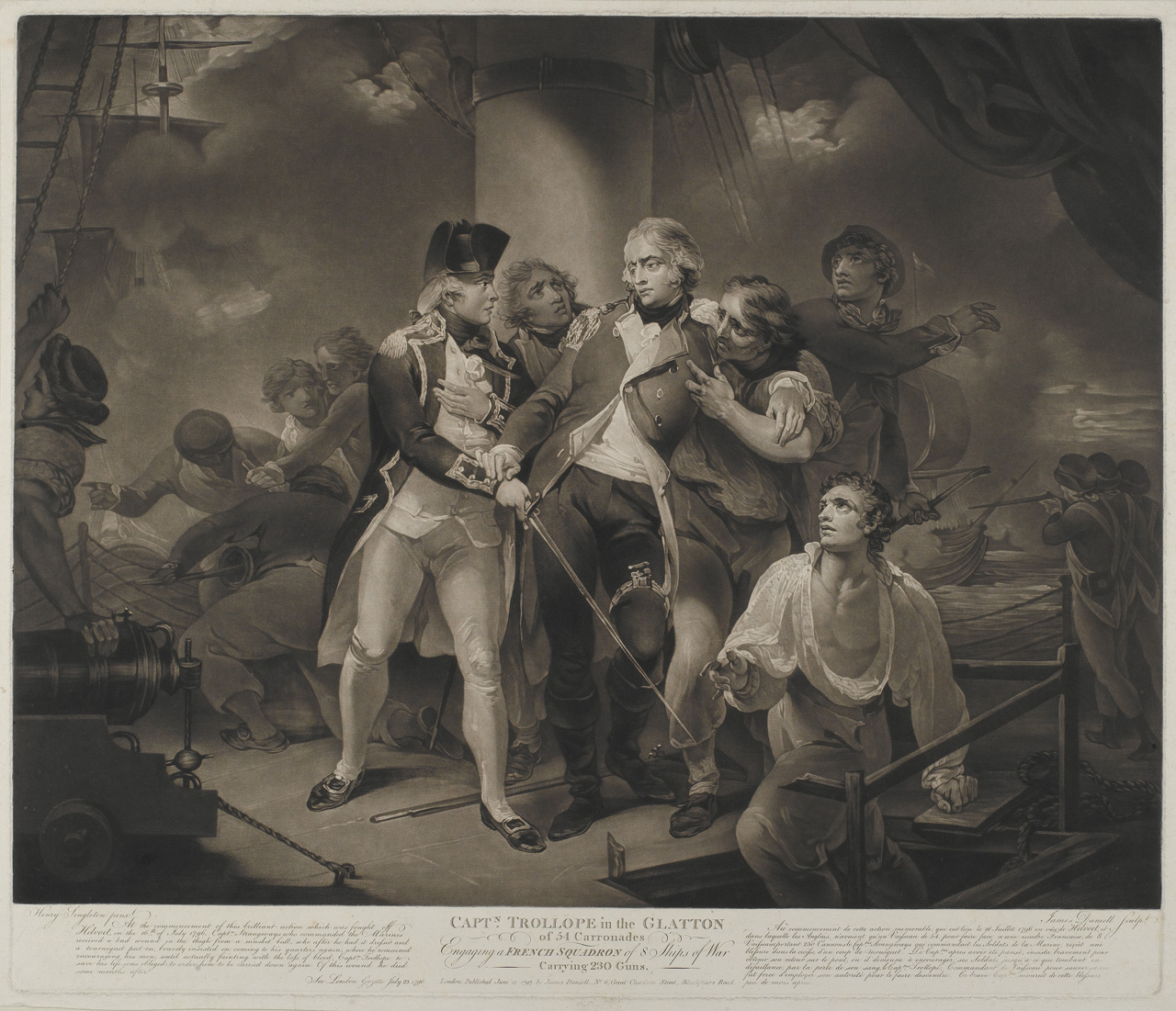 Capt. Trollope in the Glatton, of 54 Carronades Engaging a French Squadron of 8 Ships of war carrying 230 guns. Coloured mezzotint entitled 'Capt. Trollope in the Glatton, of 54 Carronades Engaging a French Squadron of 8 Ships of war carrying 230 gun