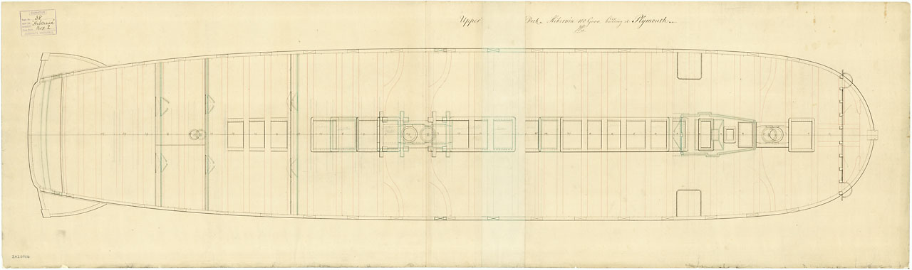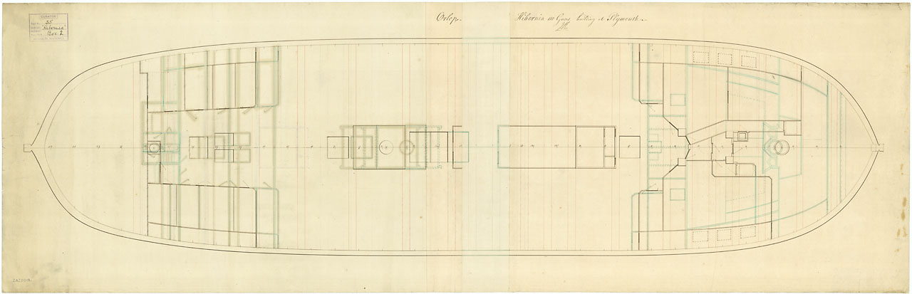 'Hibernia' (1804). Scale: 1:48. Plan showing the upper deck with alterations for lengthening 'Hibernia' (1804), a 110-gun, First Rate, three-decker. The plan has been altered by having an additional piece of paper inserted to take into