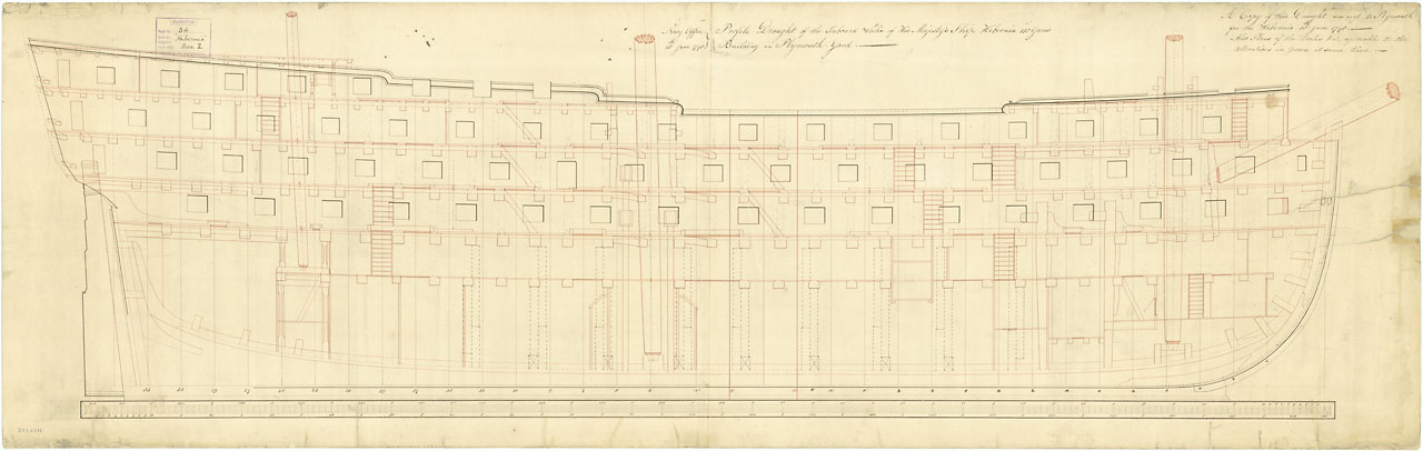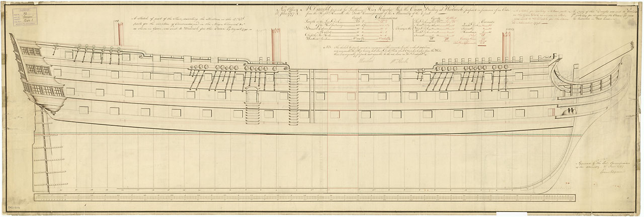 Ocean (1805). Scale 1:48. Plan showing the profile proposed (and approved) for lengthening the 'Ocean' (1805) a 98-gun Second Rate, three-decker. The plan also includes other alterations from 1798 and some pencil details illustrating her cut dow