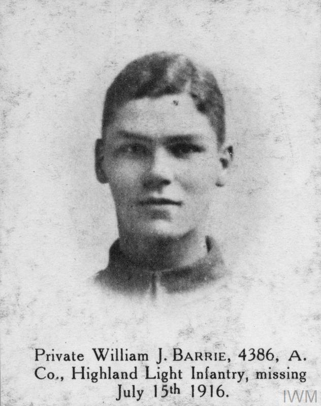 Private William J. Barrie 4386/331593. Unit: "A" Company, 9th (Glasgow Highlanders) Battalion, Highland Light Infantry. Death: 15 July 1916, Somme, Western Front. Commemorated on the Thiepval Memorial.