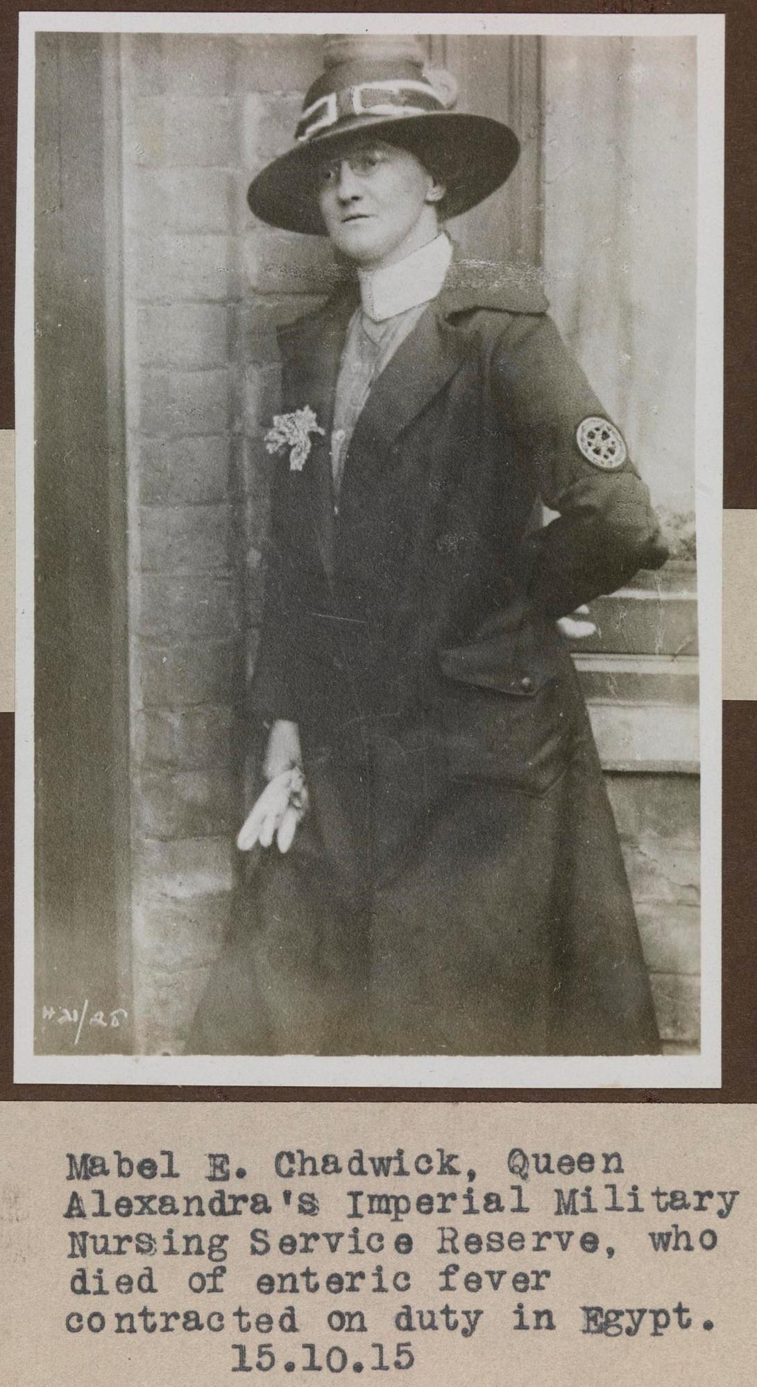 Nurse Mabel E Chadwick, Queen Alexandra's Imperial Military Nursing Service Reserve. Died of enteric fever contracted on duty in Egypt 15 October 1915.