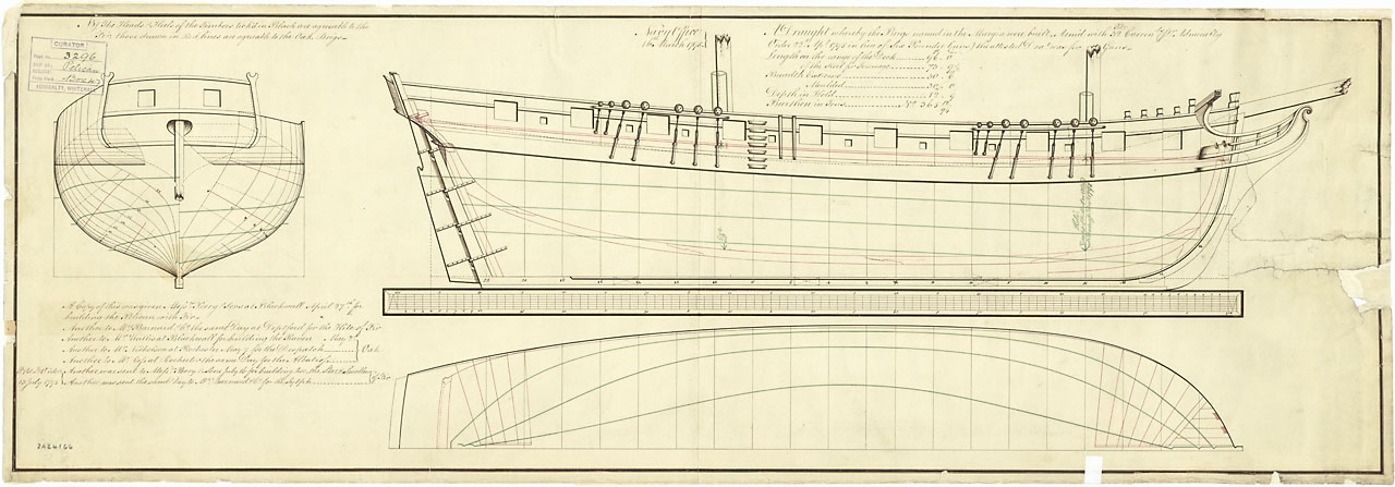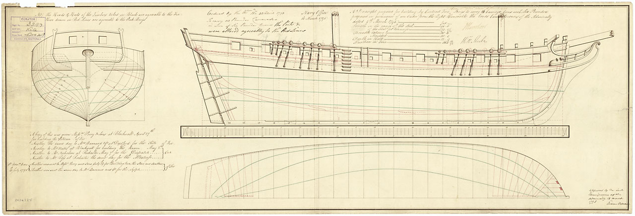 Pelican (1795); Kite (1795); Dispatch (1795) [alternative spelling: Despatch]; Albatross (1795); Raven (1796); Star (1795); Sylph (1795); Swallow (1795).. Scale: 1:48. Plan showing the stern board outline, sheer lines with scroll figurehead, and longitud