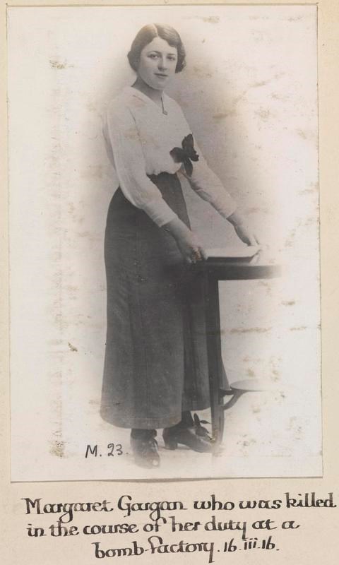 Margaret Gargan, Munitions work. Killed in the course of her duty at a bomb factory 16 March 1916.