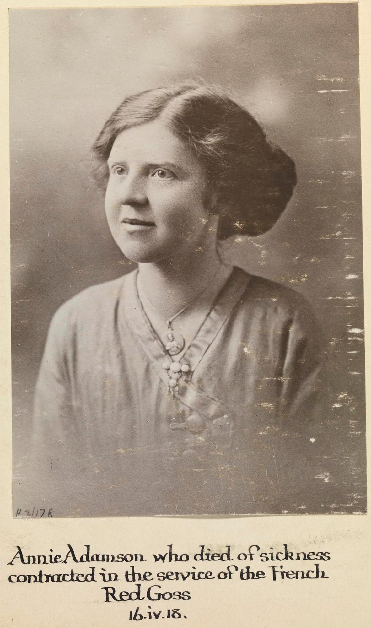 Miss Annie Adamson, Voluntary Aid Detachments. Died of sickness contracted in the service of the French Red Cross 16 April 1918.