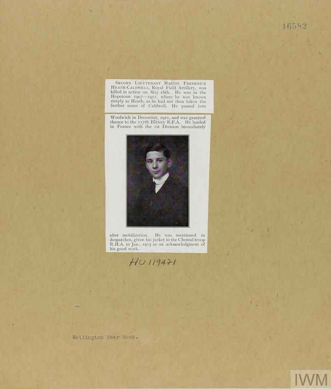 Second Lieutenant Martin Frederick Heath-Caldwell. Unit: Chestnut Troop, Royal Horse Artillery. Death: 16 May 1915 Killed in action Western Front. Younger son of Maj. Gen. and Mrs. F. C. Heath-Caldwell, of Linley Wood, Talke, Stoke-on-Trent.