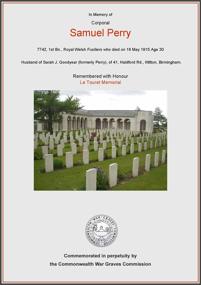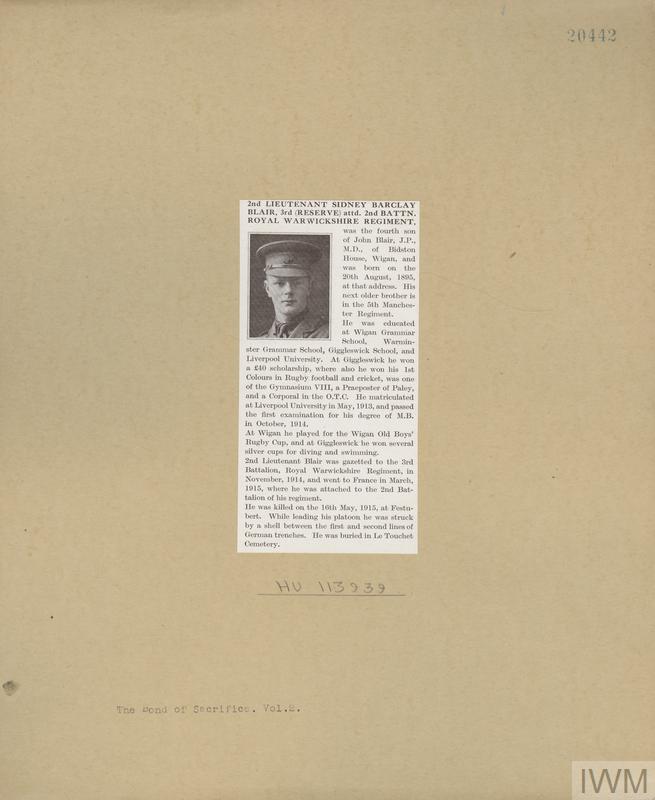 Second Lieutenant Sidney Barclay Blair. Unit: 3rd (Reserve) Battalion, attached to 2nd Battalion, Royal Warwickshire Regiment. Death: 16 May 1915 Festubert Western Front
