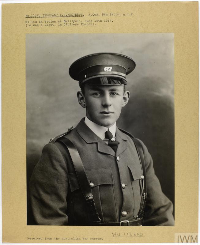 Sergeant W J Anderson 1102. Unit: A Company, 8th Battalion, Australian Imperial Force. Death: 16 June 1915 Gallipoli Dardanelles