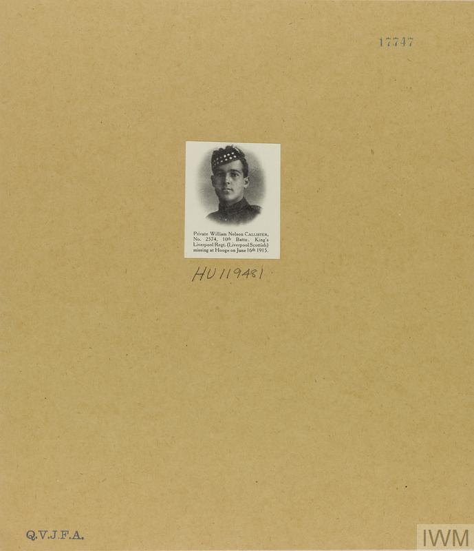Private William Nelson Callister 2574. Unit: E Company, 1st/10th Battalion (Liverpool Scottish), The King's (Liverpool Regiment). Death: 16 June 1915 Missing in action at Hooge Western Front