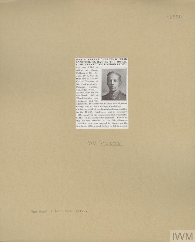 Second Lieutenant Charles Wilfred Banister. Unit: 4th Battalion, Royal Fusiliers (City of London Regiment). Death: 16 June 1915 Hooge Chateau Western Front