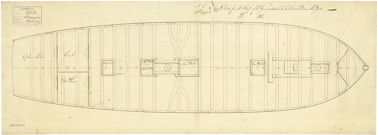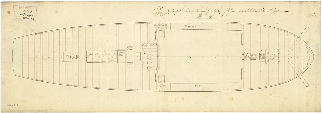 Brazen (cancelled 1799). Scale: 1:48.  Plan showing the upper deck for Brazen (cancelled 1799), an 18-gun Ship Sloop with quarterdeck and forecastle.  The ship was re-ordered and launched in 1808 as Brazen.