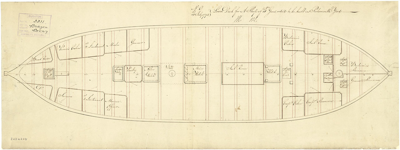 Brazen (cancelled 1799). Scale: 1:48.  Plan showing the lower deck for Brazen (cancelled 1799), an 18-gun Ship Sloop with quarterdeck and forecastle.  The ship was re-ordered and launched in 1808 as Brazen.