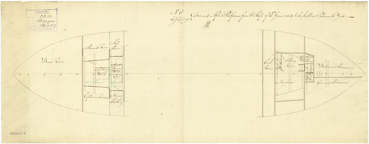 Brazen (cancelled 1799). Scale: 1:48.  Plan showing the fore and after platforms for Brazen (cancelled 1799), an 18-gun Ship Sloop with quarterdeck and forecastle.  The ship was re-ordered and launched in 1808 as Brazen.