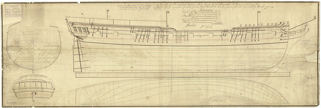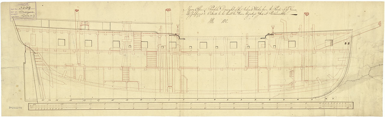 Brazen (cancelled 1799). Scale: 1:48.  Plan showing the inboard profile for Brazen (cancelled 1799), an 18-gun Ship Sloop with quarterdeck and forecastle.  The ship was re-ordered and launched in 1808 as Brazen.