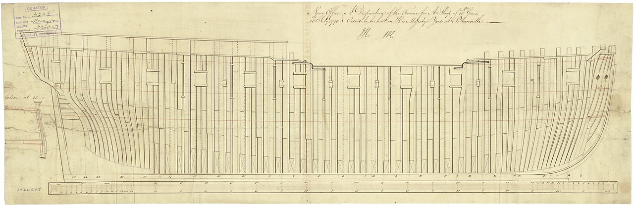 Brazen (cancelled 1799). Scale: 1:48.  Plan showing the framing profile (disposition) for Brazen (cancelled 1799), an 18-gun Ship Sloop with quarterdeck and forecastle.  The ship was re-ordered and launched in 1808 as Brazen.