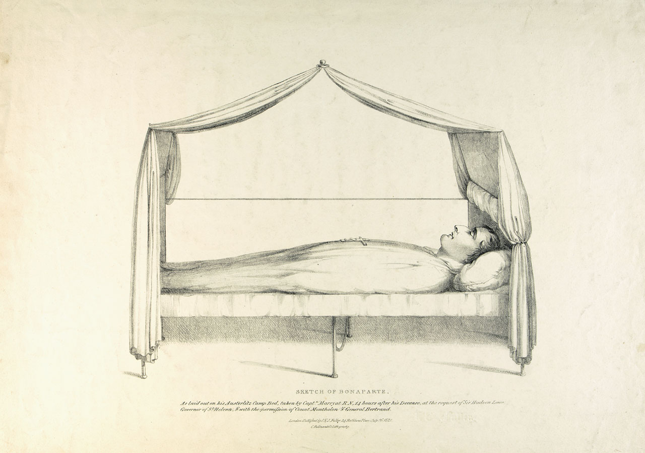 'Sketch of Bonaparte. As laid on his Austerlitz Camp Bed, taken by Captn Marryat at RN, 14 hours after his decease, at the request of Sir Hudson Lowe, Governor of St Helena, & with permission of Count Montholan & General Bertrand'. Marry