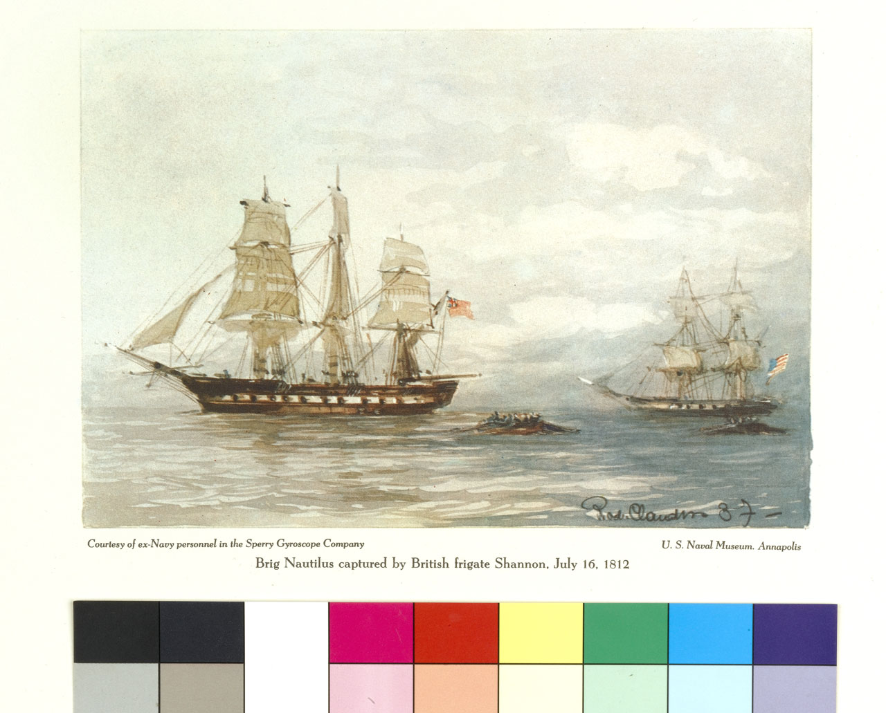 Brig Nautilus captured by British Frigate Shannon, July 16, 1812. One of a set of twenty, others are PAJ0205-PAJ0207, PAJ0209-PAJ0224.