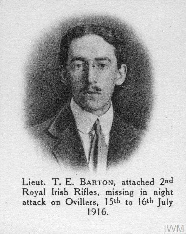 Lieutenant Thomas Eyre Barton. Unit: 14th Battalion, attached to the 2nd Battalion, Royal Irish Rifles. Death: 16 July 1916, Ovillers, Somme, Western Front.