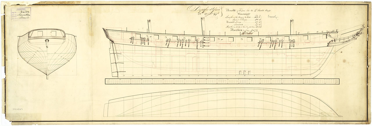 Bonetta (captured 1798). Scale: 1:48. Plan showing the body plan with stern board outline, sheer lines with inboard detail and figurehead, and longitudinal half-breadth for Bonetta (captured 1798), a captured French privateer, as fitted as an 18-gun Ship