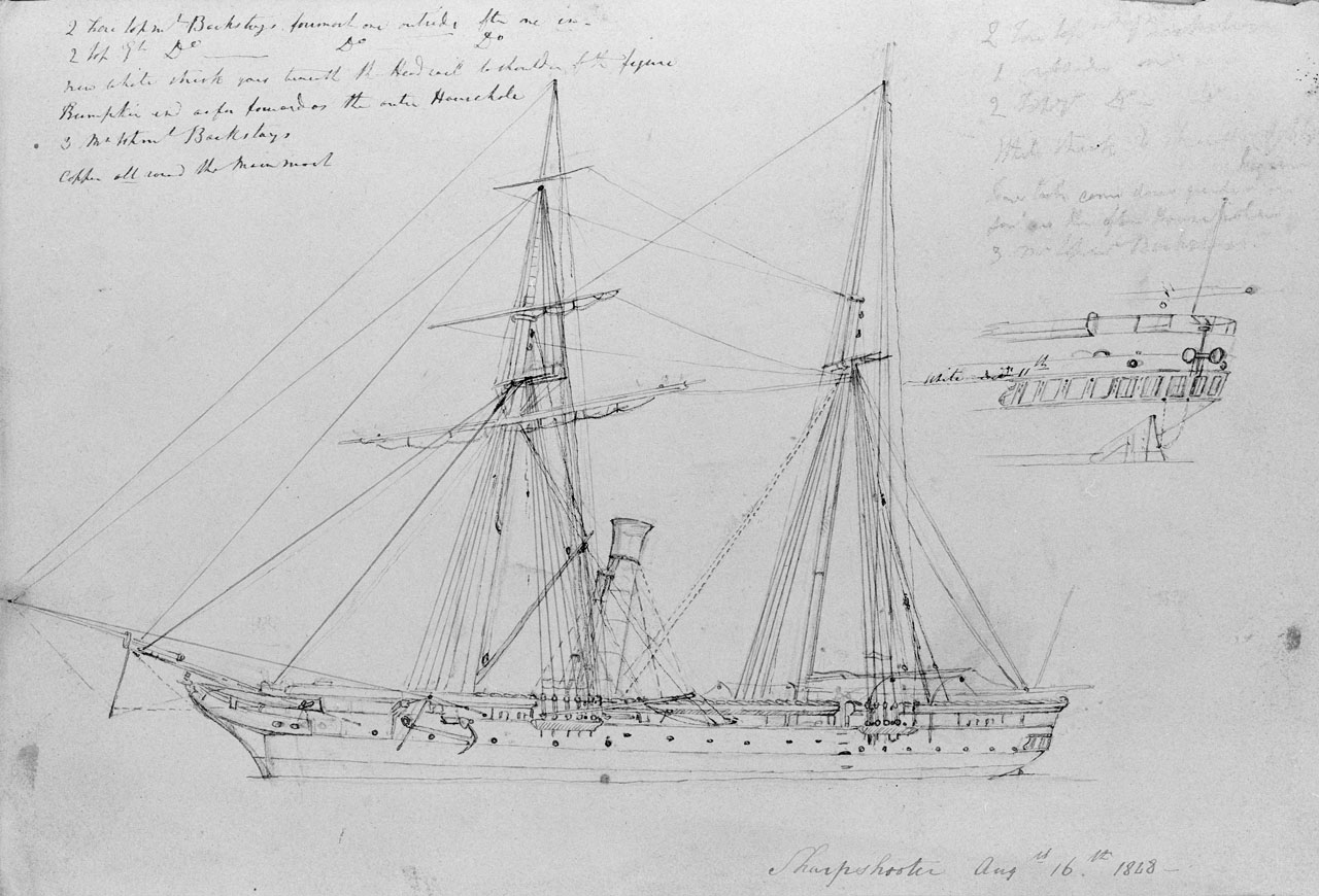 Sketch of steamer Sharpshooter Augst 16th 1848 (with notes). Stored with PAH4442-PAH4499, PAH4501-PAH4521.