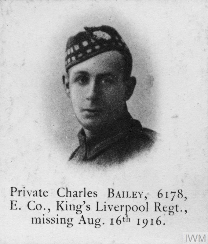 Private Charles Bailey 6178/357297. Unit: "E" Company, 1st/10th Battalion, the King's (Liverpool Regiment). Death: 16 August 1916, missing, Somme, Western Front. Commemorated on the Thiepval Memorial.