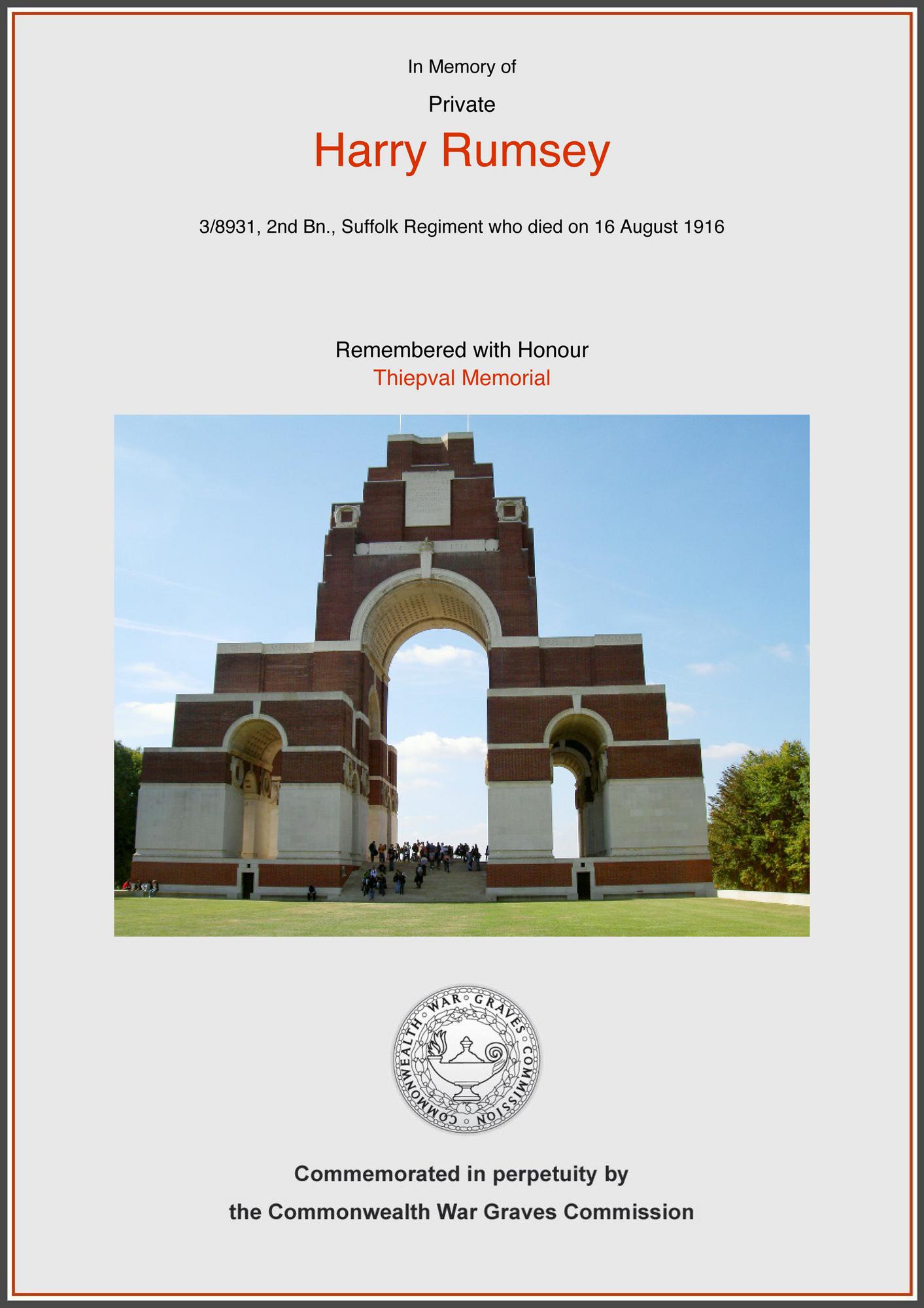 Private James Booth 26797. Unit: 2nd Battalion, Suffolk Regiment. Death: 16 August 1916, missing, Somme, Western Front. Commemorated on the Thiepval Memorial.