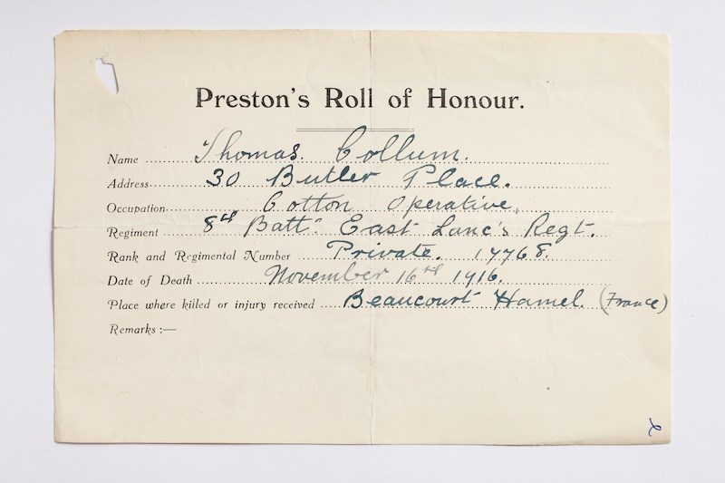 Second Lieutenant James Hunt. Unit: 10th Battalion (attached to 8th Battalion), East Lancashire Regiment. Death: 16 November 1916 Killed in action at Beaumont Hamel Western Front