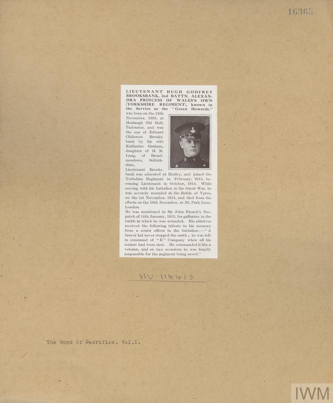 Lieutenant Hugh Godfrey Brooksbank MID. Unit: 2nd Battalion, Yorkshire Regiment (Green Howards). Death: 16 December 1914 Of wounds received at Ypres